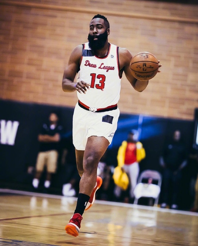 图为正在参加德鲁联赛的火箭球员詹姆斯-哈登,可以看到他用黑色胶带遮盖了德鲁联赛球衣和球裤上的Nike Logo,作为adidas代言人的他,可以说是处处为东家着想。
