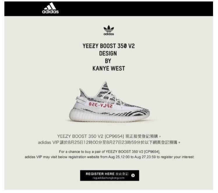 听说今天有朋友收到了adidas发来的邮件,并显示白斑马Yeezy将再次补货!不过只有身为VIP的用户才能收到adidas的这封邮件,没有收到这封邮件就无法登记咯,所以身为VIP的你,赶紧去看看自己的邮箱吧!