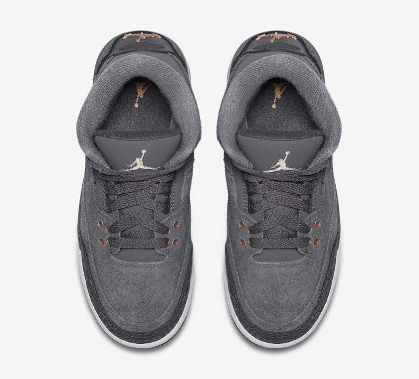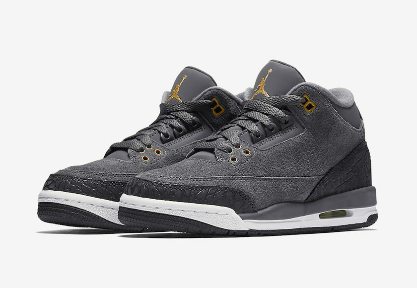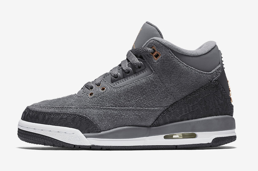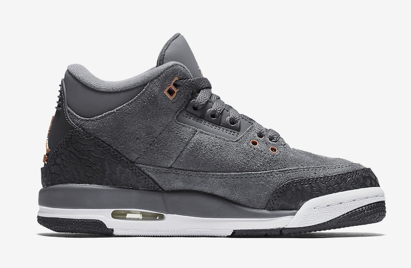 Jordan 品牌即将为女生们带来一款全新打造的 Air Jordan 3,此款选用无烟煤色的翻毛皮革包裹鞋身,同时辅以黑色爆裂纹的皮革点缀鞋头以及后跟,鞋扣、鞋舌以及后跟的 Jumpman 则由金色点缀,最后搭载白色中底以及黑色外底呈现。