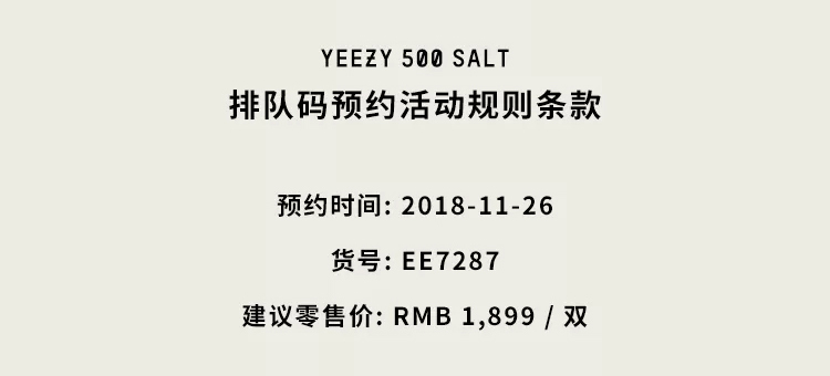 本周末 Yeezy 500 “Salt” 将迎来正式发售,今早 adidas Originals 也公布了公众号的登记信息,将在今天中午 11:00 正式开启排队码的先到先得预约资格!