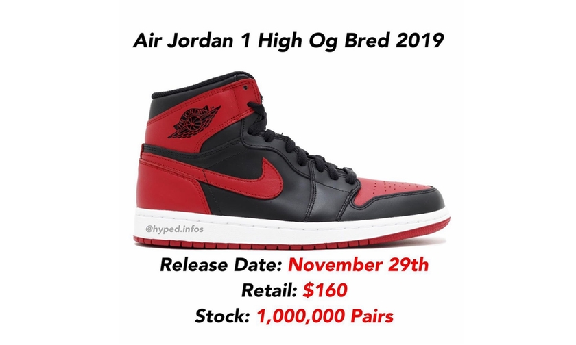据悉,Air Jordan 1 “Bred” 2019 全新复刻版本仍将于 11 月 29 日 “黑色星期五” 登场,感兴趣的朋友关注一下吧,希望这次是真的吧。