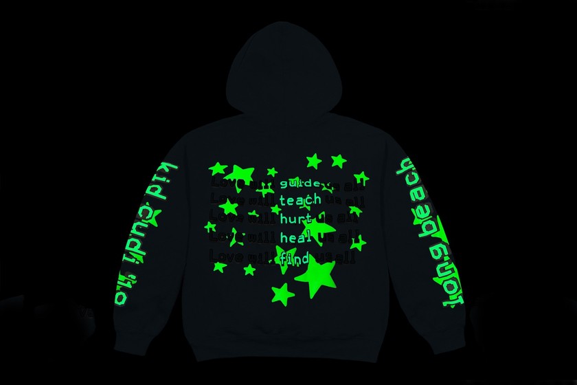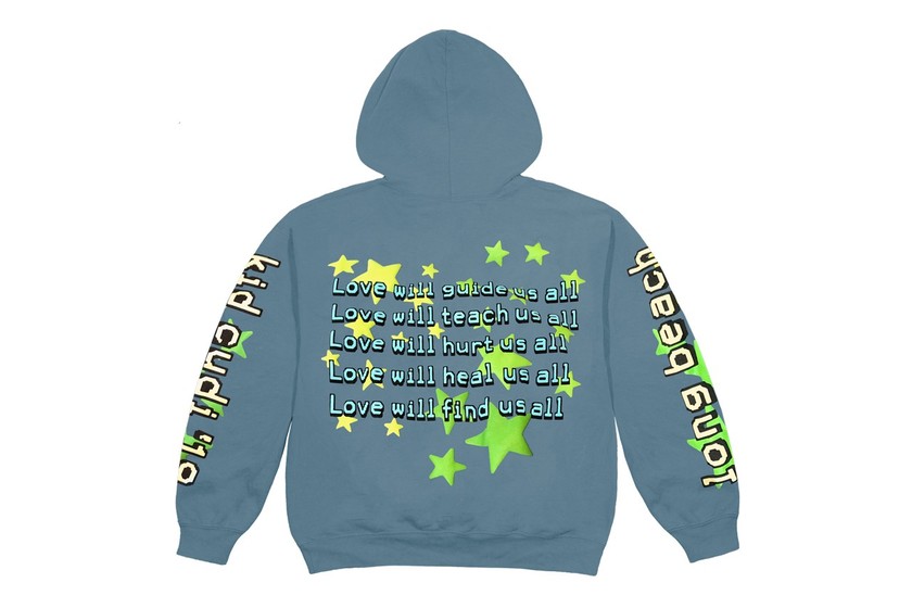 这件卫衣采用湖水蓝为主基调,整件单品注入了带有夜光效果的星星元素,在黑暗中炫目无比。而双袖“Kid Cudi’19”、“LONG BEACH”字样以及背后Kid Cudi 新曲的文字,则点明了设计主题。