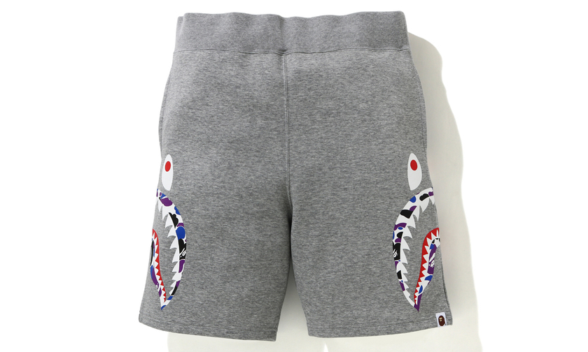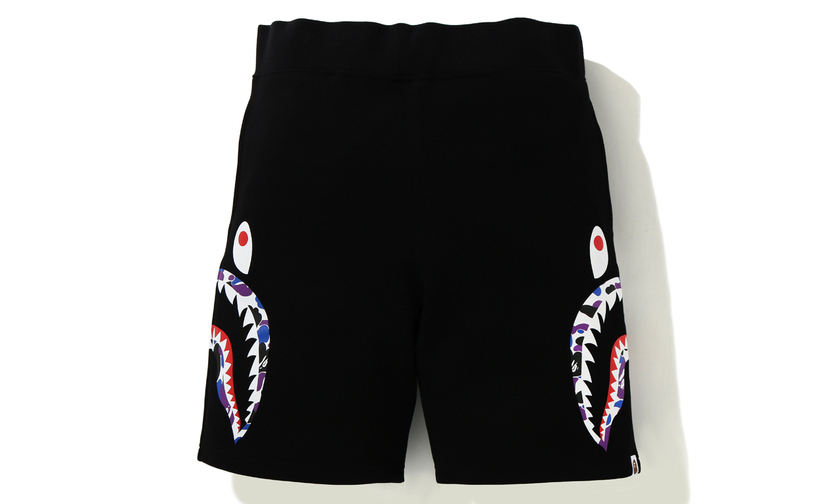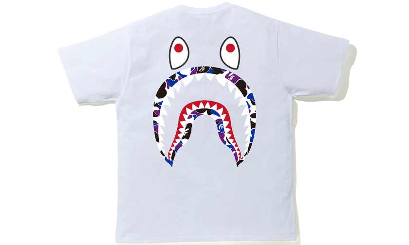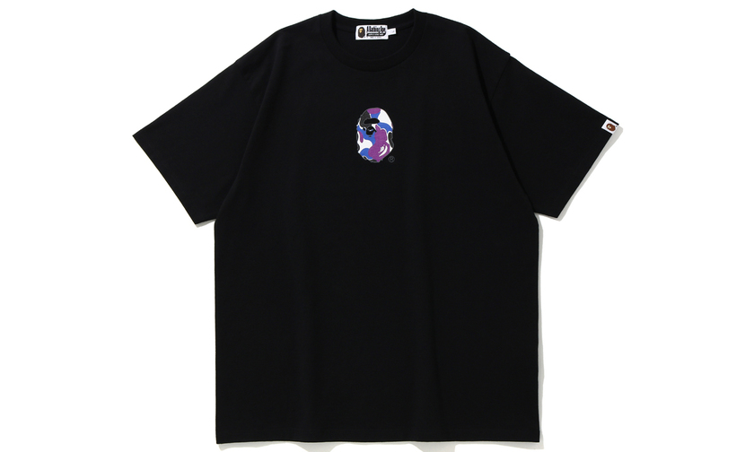 设计以与 BAPE 香港门店有关的紫色,蓝色和黑色迷彩图案主打,品牌标志性元素经典的鲨鱼和猿人头注入,辨识度与街头潮流姿态十足。部分 T恤上还有“HKG”的香港限定 logo ,特殊身份展露无疑。
