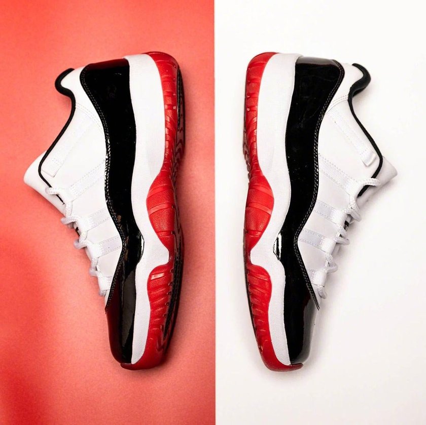 看完了百搭款让我们来看看经典款,AJ11。Concord Bred康扣黑红是今年刚刚推出的全新配色,将AJ11经典的康扣和黑红配色完美结合。白色为主的鞋身和标志性的黑色漆皮材质OG十足,用红色点缀整个大底和其它部分的细节更让鞋款整体更具AJ球鞋的经典乔丹公牛元素。