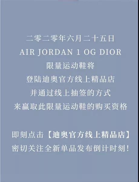从 4 月跳票以来,一直处于话题顶峰的 Dior 与 Jordan Brand Air Dior 系列,在昨日终于迎来正式官宣。Dior 方称,Dior x Air Jordan 1 将于 6 月 25 日正式登陆 Dior 微信官方时尚精品店小程序,并通过线上抽签的方式发售。