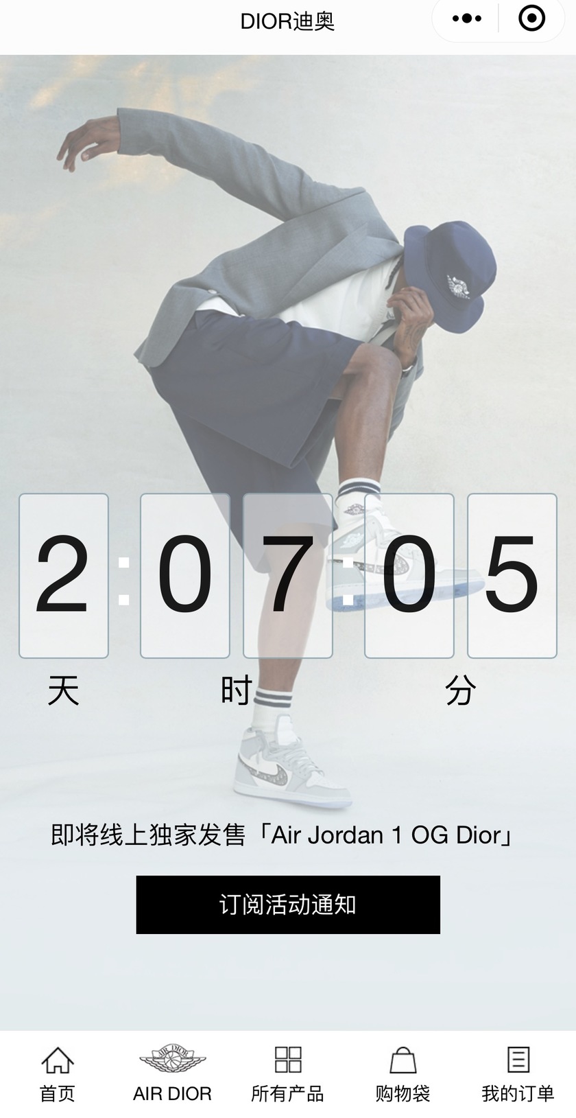 同时,小程序 Air Dior 界面也开启了倒计时模式,可以看到再过 2 天 7 小时,万众期待的 Dior x AJ 1 就将正式发售了。