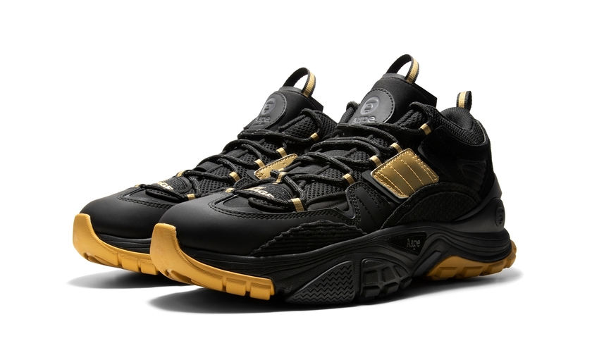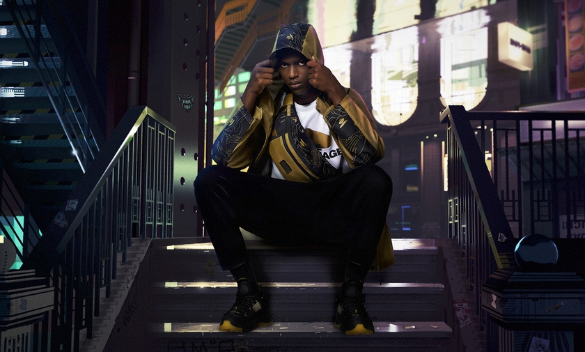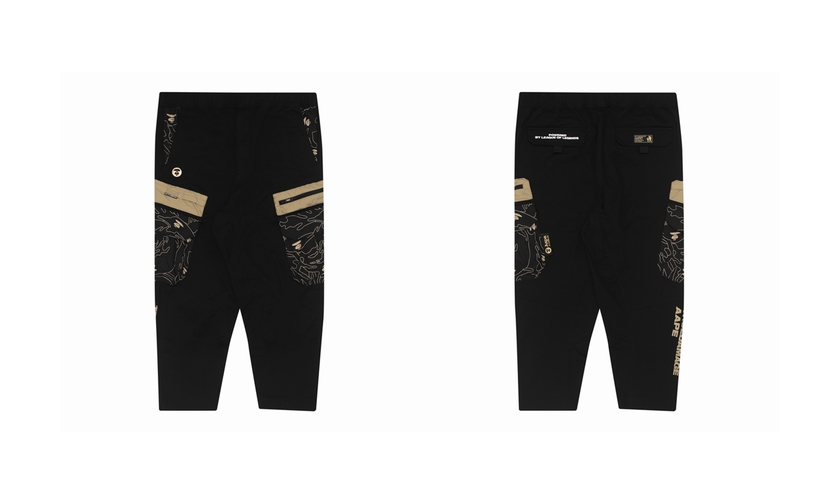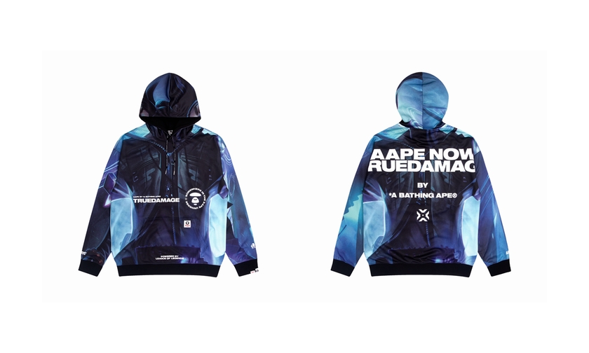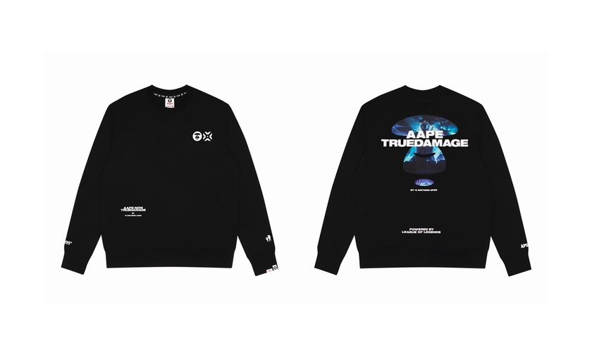 服饰包括两个部分,第一部分设计与“真实伤害”亚索至臻皮肤的外形概念一致,采用黑、金色调主打,结合 AAPE 的标志性“Moon Face”图像与代表“真实伤害”乐团的 logo 呈现,带来冲锋衣外套、T 恤、工装长裤、腰包与 AAPE Dimension 运动鞋等单品。