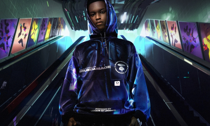 第二部分设计则灵感来源于亚索在“真实伤害”乐队中的 DJ 形象,AAPE 使用数码印刷的技术,并通过 Oversize 与宽松的剪裁廓形表现出“真实伤害”乐队所具备的强烈 Hip-Hop 元素。