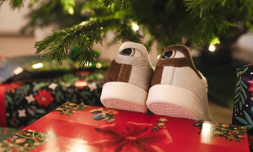 鞋款采用深棕与奶油色不对称拼接主打,翻毛皮材质塑造,搭配后跟俏皮搞怪的小魔怪眼睛,吸睛度与规格超高。另外,鞋盒设计也别出心裁,以极具圣诞氛围的圣诞礼物印花,入手当做圣诞礼物也不是不可。