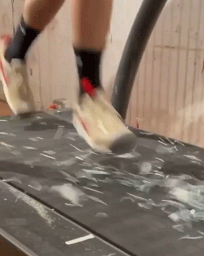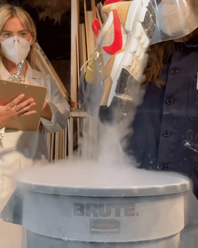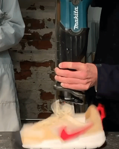 同时,Tom Sachs 还发布了一个有趣的视频。视频中这双鞋经过踩玻璃、捶打、冰冻、喷水等严苛的测试后依旧“毫发无损”,它不仅拥有前卫科幻外观,还拥有全能实用性。