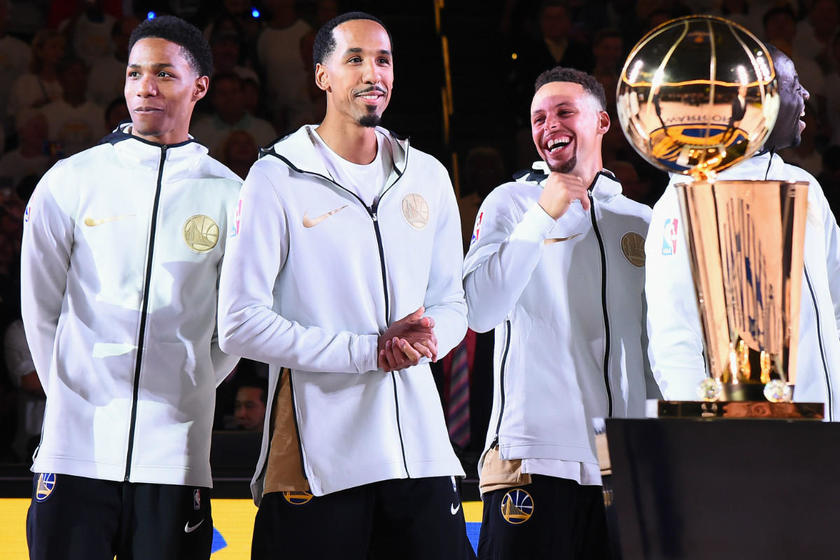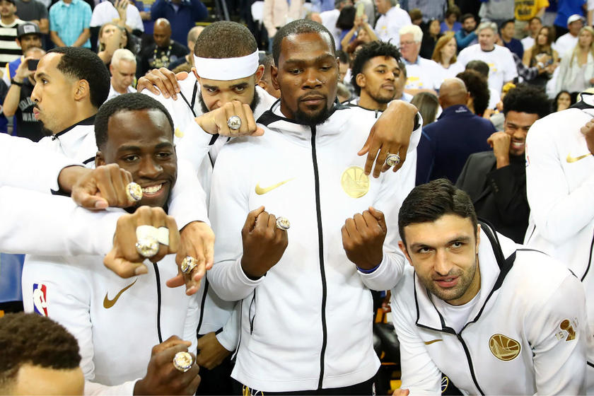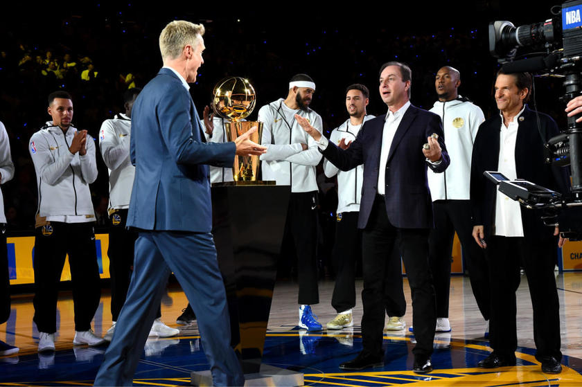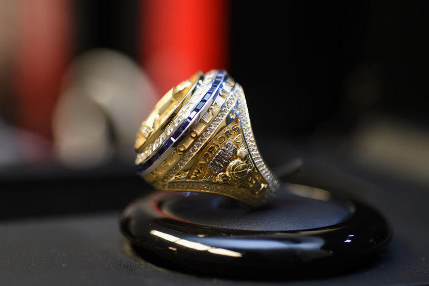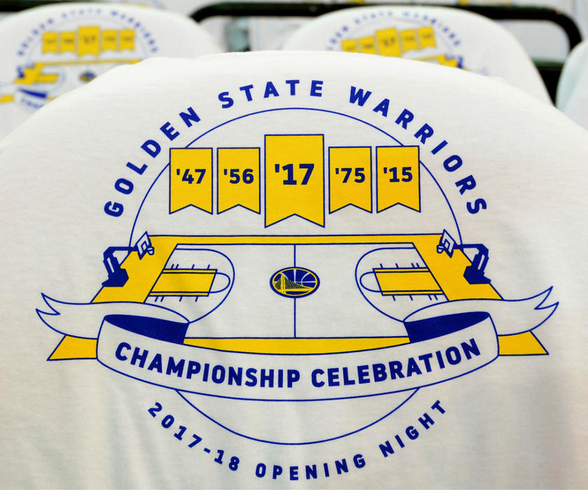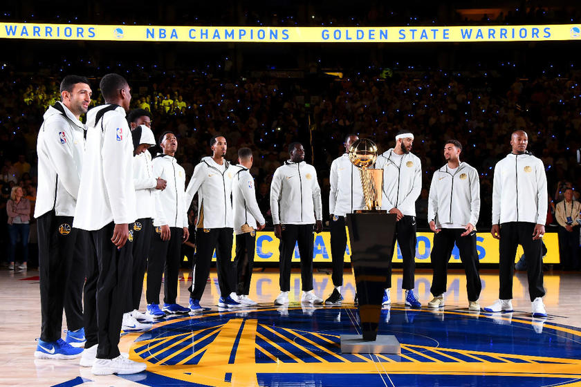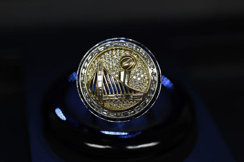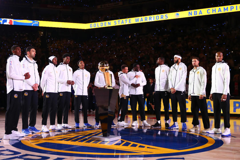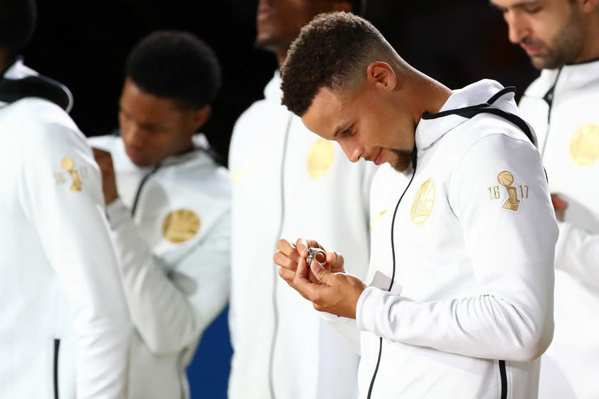 北京时间10月18日,2017-18赛季NBA揭幕战打响,在勇士与火箭比赛开始之前,联盟为2017-17赛季总冠军勇士全员颁发了冠军戒指。