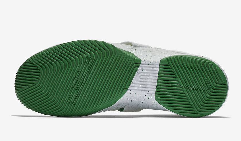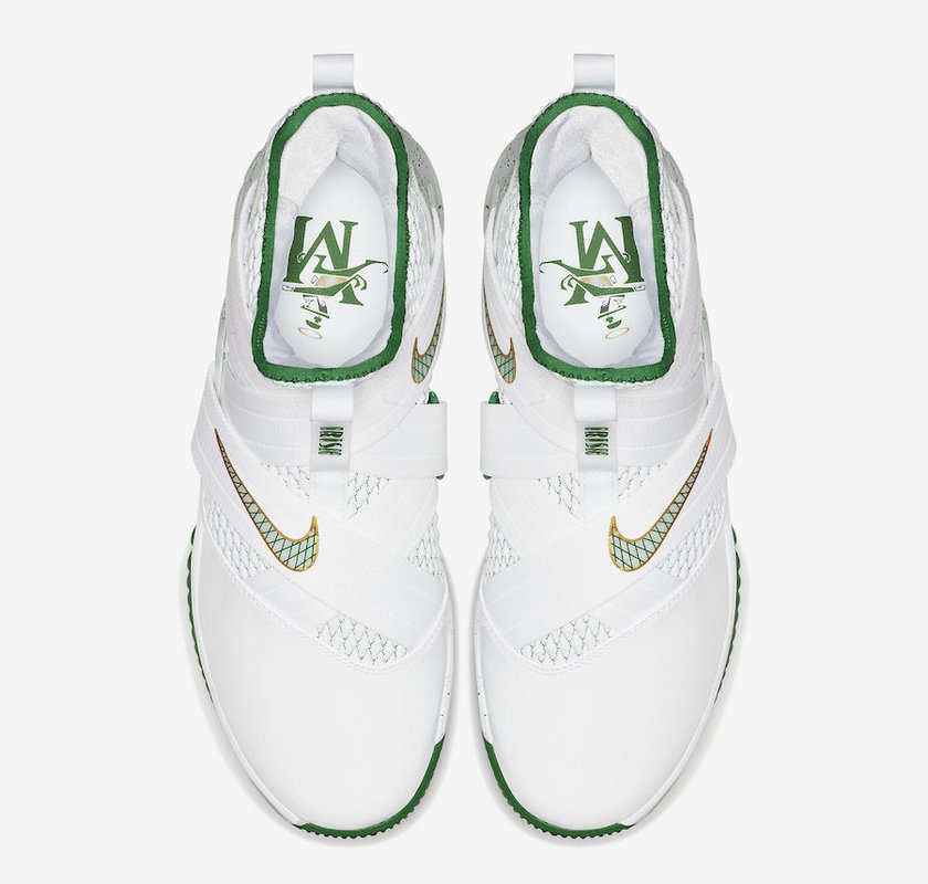 采用圣文森特圣玛丽高中主场的白、绿、金三色色调,编织鞋面以白绿网格设计装点,鞋头加入漆皮材质,与编织鞋面呈现出两种不同质感。白色的绑带设计上,以金色线条勾勒出 Nike Swoosh 轮廓,中间同样以白绿二色网格设计,与鞋面完美呼应。中底采用泼墨式设计,同样与整体设计十分吻合。鞋垫上印有圣文森特圣玛丽高中的 “M” Logo,直击设计主题!