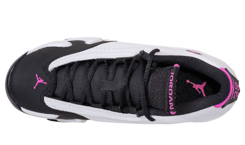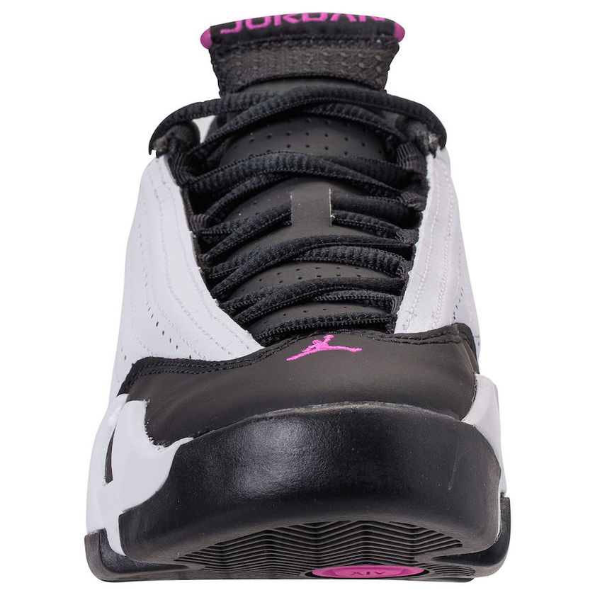 这款 Air Jordan 14 GS “Fuchsia Blast” 采用类似AJ1黑脚趾的配色风格,鞋头、鞋舌、后跟以及大底采用纯黑配色,而两侧鞋面则采用纯白色调呈现。14代标志性的法拉利 Jumpman Logo 以及少许鞋面细节则以粉嫩的粉色点缀,百搭且极具辨识度。