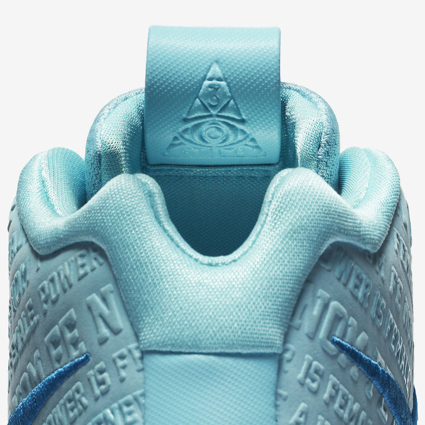 鞋款以备受女生欢迎的 Tiffany 蓝为基调,辅以湖水绿配色的刺绣 Nike Swoosh 以及白橙二色锯齿大底,配色极为清爽亮眼。鞋帮处印有 “Power is Female” 以及 “We Are a New Generation” 的标语,后跟还出现篮球主题女性符号,细节出众,直击设计主题!