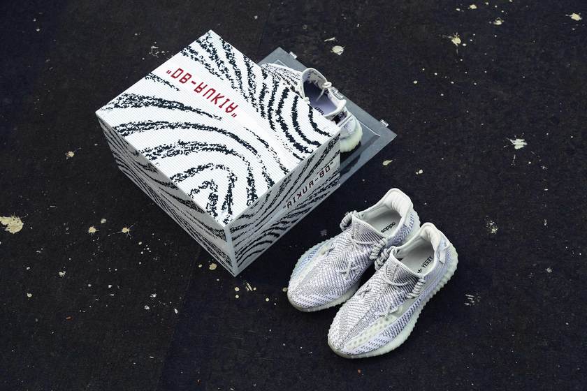Yeezy球鞋经典元素大面积地提取赋于鞋盒表面,别具一格。鞋盒表面的斑马斜纹元素与yeezy造型动感富有灵活的线条交相呼应。