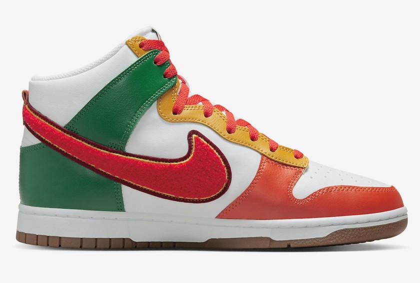 最近一双全新的 Nike Dunk High University “Chenille Swoosh”公布了官图。整体配色采用橙色、黄色、绿色的搭配,加上鞋身侧面的毛绒材质 Swoosh,视觉效果十分出众。据悉这双全新的 Nike Dunk High University “Chenille Swoosh” 会在今年年内正式发售,发售价格为 120 美元。